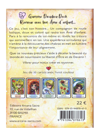 La Gamme doudou·deck Arcana Sacra : pour petits et grands de 7 à 77 ans… Cet Oracle fut créé à l’origine par son auteure, Stéphanie Gras, pour des anniversaires d’enfants. C’était un acte créatif mêlé de saveurs spirituelles afin de semer, au sein des foyers, des graines de pensée positive. Chaque carte est une invitation au développement personnel. Ce jeu, c’est ton histoire…