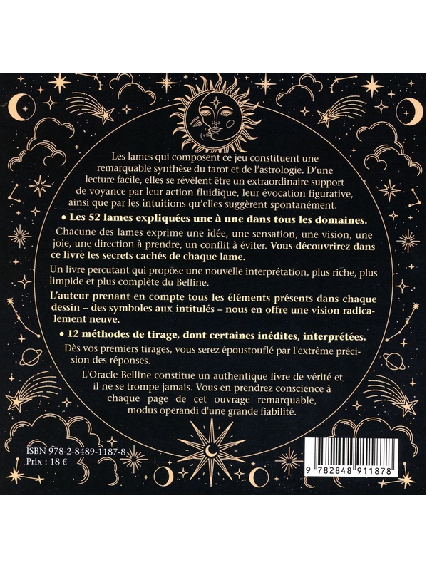 Les Lames de l’Oracle Belline qui composent ce jeu constituent une remarquable synthèse du tarot et de l’astrologie. D’une lecture facile, elles se révèlent être un extraordinaire support de voyance par leur action fluidique, leur évocation figurative, ainsi que par les intuitions qu’elles suggèrent spontanément. Chacune des lames exprime une idée, une sensation, une vision, une joie, une direction à prendre, un conflit à éviter. Un livre percutant qui propose une nouvelle interprétation, plus riche, plus complexe et plus complète du Belline. L’auteur prenant en compte tous les éléments présents dans chaque dessin – symboles aux intitulées- nous en offre une version radicalement neuve.
