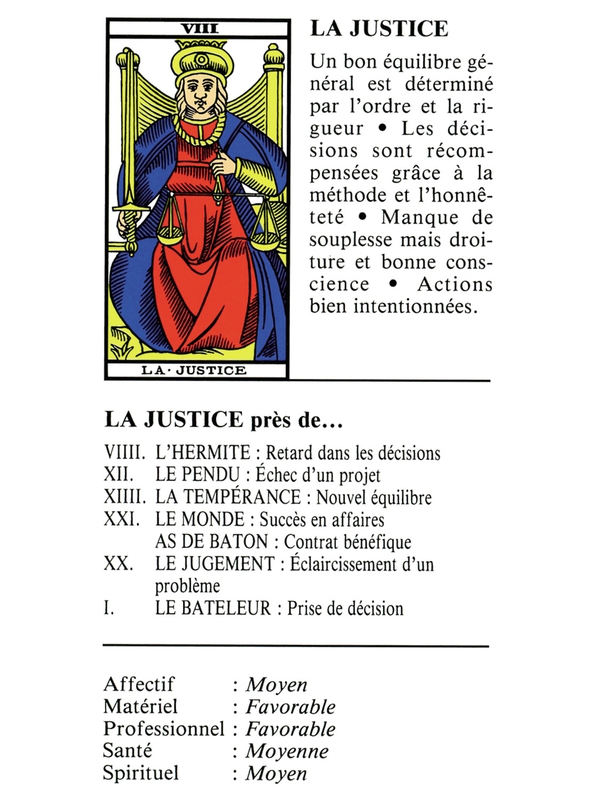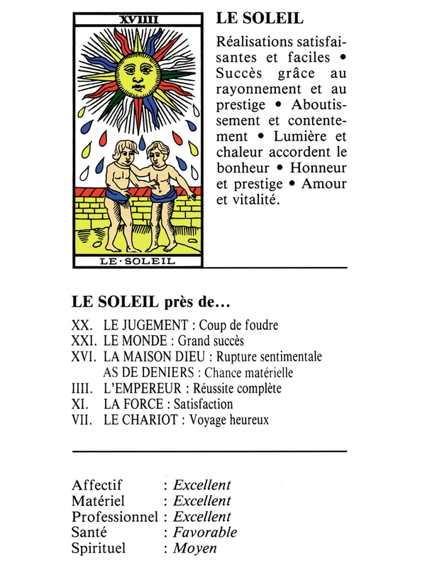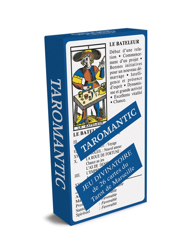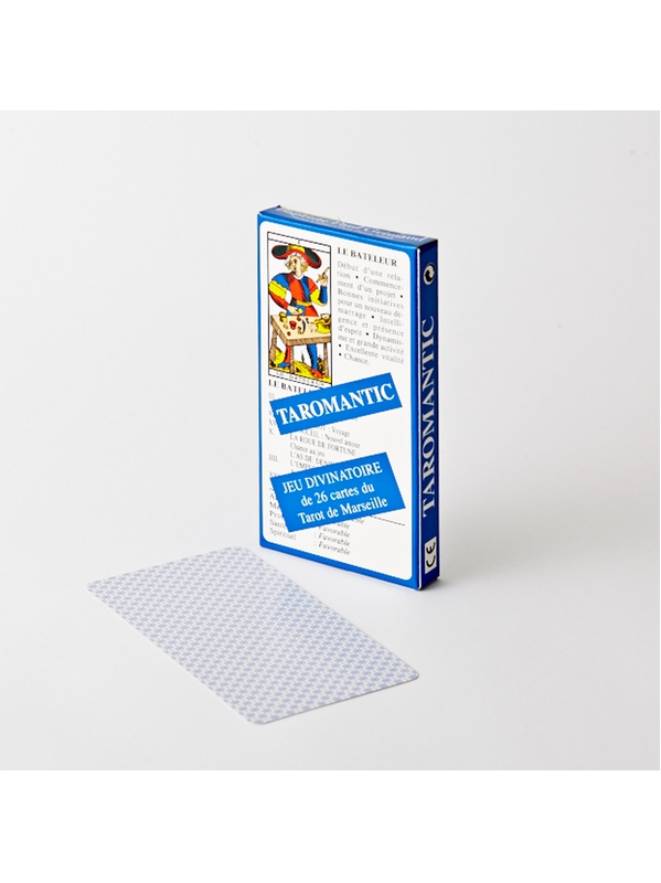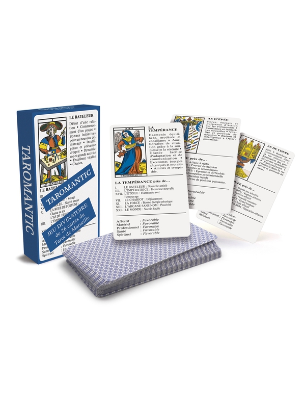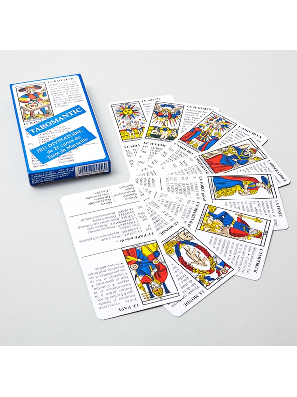 Jeu Divinatoire de 26 cartes du Tarot de Marseille. Ce jeu de taromancie est une version simplifiée de l’ancien Tarot de Marseille. Les significations des 22 arcanes majeurs plus les 4 As sont indiquées sur la carte ainsi que les influences des cartes voisines.